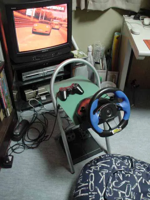 いろいろ試してみましたが、結局、今は折りたたみ式のイスに固定して遊んでます。イスだと軽いので、ゲームに白熱してくるとハンドルをイスごと傾けちゃうくらいガタガタ動かしてしまいますけど、テレビの高さとのマッチングとコンパクトさで、これに落ち着いてます。