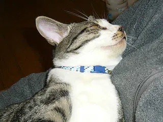 首輪をつけると、撫でた時に首もとのやわらかい感触を邪魔するのでもったいない。けど、もし家から脱出してしまったときに、飼い猫と分かるよう首輪はつけておいた方が良いらしいのですよ。仕方ない。