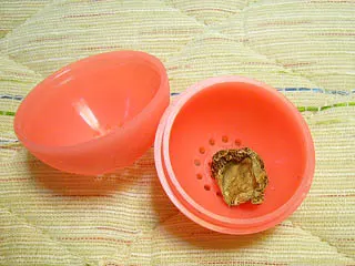 マタタビの実のカケラ。ボール状の容器に入れてルーに与えてみる。生後半年ほどの時には、爪とぎについていたマタタビにまったく無反応だった。子供には効かないものらしい。ルーも大きくなったし、そろそろ効くかな?