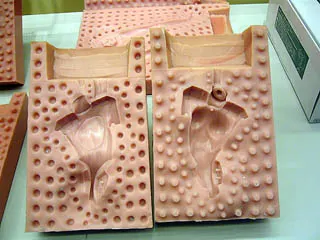 フィギュアの型。これは綾波レイのもの。固定のための穴が、これでもかってくらいあいてますね。ぶつぶつ具合がちょっと鳥肌物かも。