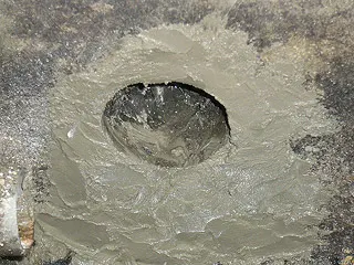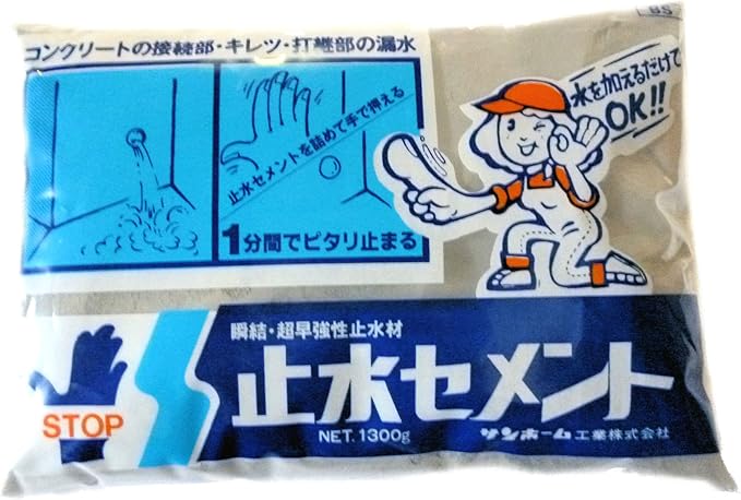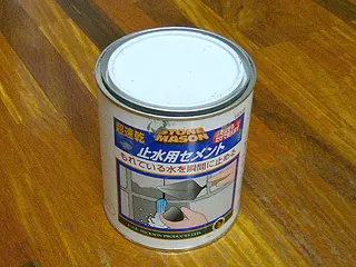 超速乾性の止水用セメントを購入。これが、今まさに水が噴出している穴をも塞ぐことができる超強力なセメント。粉末に3:1の割合で水を混ぜ、よく練る。数分で固まってしまうので迅速に穴へ盛り付けた。