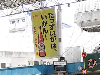 「たっすいがは、いかん!」高知市のひろめ市場で見かけたキリン・ラガービールのキャッチコピー。たっすいが?「呑みすぎは、いかん!」という意味?