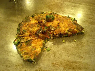 おまかせで作っていただいた特製のねぎ焼き。厚さ5cm近くはねぎを盛り付けて焼くので、ねぎがぎっしりサンドされているぞ。たっぷり煮込まれたスジ肉とコンニャクが入ってとてもおいしい。おいしくて写真を撮る前に手を付けてしまった。右下の欠けた部分は想像で補ってください。モダン焼きもおいしくて写す前に平らげちゃった…