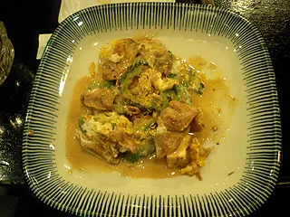 いつもある訳ではないのだが、ゴーヤーの炒め物。ゴーヤーの含有率がいい!ひとくちに一切れくらいが、苦味がほどよく効いておいしいのよね。