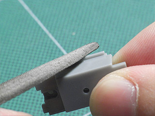 ヤスリでならします。ヤスリは力をいれず、押すときに削るのを意識してまっすぐ動かしましょう。斜めに動かすと、細かなスジ状に削れてしまうことがあります。