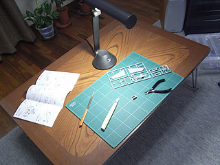 ちなみに、今回の制作環境。折りたたみのテーブルにカッターマットをひいて、蛍光灯スタンドで手元を明るくして作業してます。
