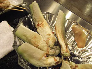 自家製の水ナスの漬物。丸々一個を半分まで切り込みを入れ、後は手で引き裂いて盛ってくれる。裂いた部分がサクサクした食感でおもしろい。そのままでなく、どこか一工夫あるのが素敵ですねぇ。