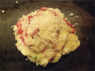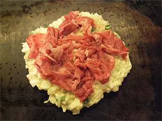 本日のメインは特製牛肉お好み焼き。ベースが焼けてきたら牛肉を載せ…