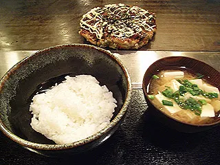 ごはん、お味噌汁をつけて、お好み焼き定食の完成。満足しました。