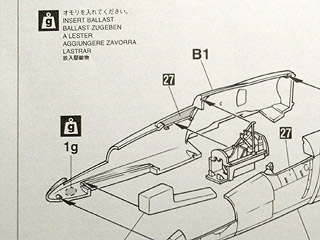 いよいよ、本体の組み立てに入りました。設計図を見ると、機首にオモリを入れるように指示されています。入れないまま作ってしまうと、完成して飾った時に機首が持ち上がって尻もちをついてしまうのですね。