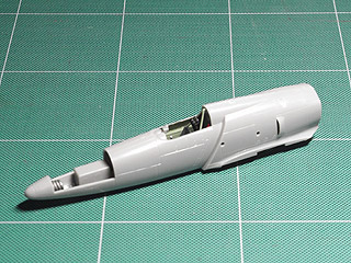 先に作ったコックピットや、主脚が収まる部分を挟んで本体を組み、接着しました。本体の基本部分ができてきました。