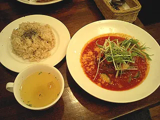 ライスは玄米を選んでみました。玄米のシャキシャキ感を残しつつ、しっとり感のある絶妙の炊き加減。塩とスパイスがほのかに効いてます。スープはピリッとコショウのはっきりした味付け。良かったです。