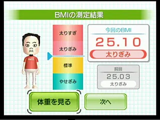 BMIは25.10と出た。やっぱり、ちょい太りぎみ。Miiの体型がぽっちゃりに変化して、より自分に近い印象になったのが悔しいような嬉しいような。
