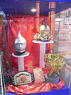 キン肉マンの黄金のマスクと銀のマスク、トロフィーが!うわ、漫画で見たのそのままだ!横にはキン消しが418体、フルコンプリートされて展示されてましたよ。