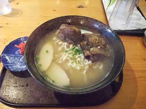 首里食堂 あかばなーというお店に飛び込んでみた。ソーキソバ、めちゃうま!ソーキがゴロッと肉厚でやわらかくて煮汁の甘みがうまい。骨にも浸みててチューチュー吸いました。スープは白くコクがありますが、しつこくなくあっさりめ。かすかに灰っぽい香りが。本格的?麺は器の底までぎっしり詰まってておなかが満足しました。