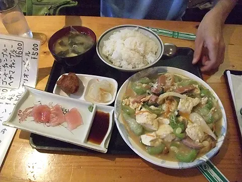 ナーベラー(ヘチマ)チャンプルーもうまい!このボリュームで600円。ヘチマはウリとナスの中間みたいな感じでした。沖縄では若いうちに収穫して使うそうです。添えられていたサーターアンダギーは油っこくなくて、ふっくら甘い。ガイドブックにも載ってなかったのだけど、この店は穴場だ!後でタクシーの運転手に聞いたのだけど、ナーベラーチャンプルーがうまい店は決まって全部うまいそうだ。