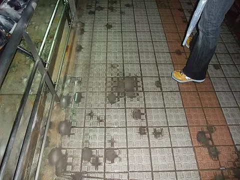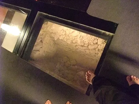 首里城の中にも入ってきました。靴を脱いではだしに。板の間が気持ちよかった。濡れたまま歩いて靴擦れを起こしかけてたので、助かりました。写真は、再建される前の本来の首里城基礎部分だそうです。