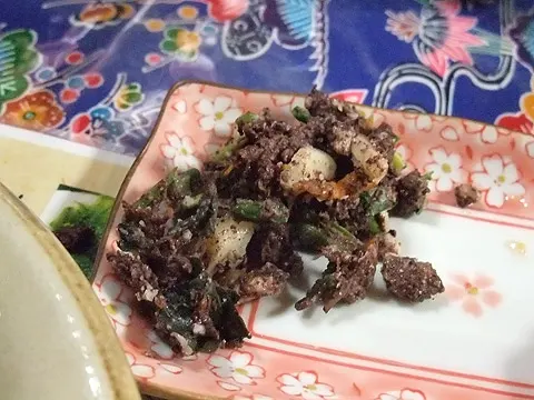 ヤギの血の炒め物。血って熱を加えるとお肉みたいになるんですね。これも独特の臭みが酒に合う。にんにくが効いてます。
