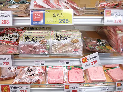 帰りに24時間営業のスーパー、りうぼうに寄ってみた。ミミガーが普通に売ってる。ハムは四角いのばかりですね。関西では丸いのが多いです。