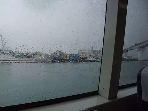 2日目、渡嘉敷島へ向け、高速船に乗る。まだ天気は悪くて、波も高い。酔いました…
