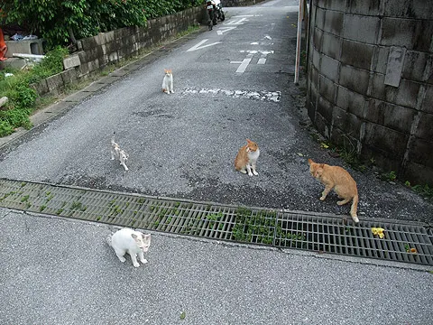 ブルーシールのアイスクリームを食べながら集落をうろついていると、フゥーゥ!フゥーゥ!猫に囲まれ、かつあげにあいました。あげない。
