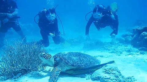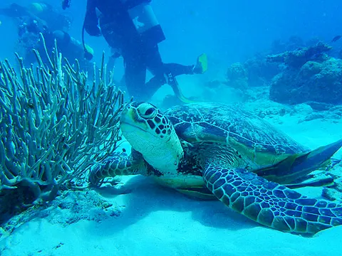 渡嘉敷島には4匹のウミガメが住み着いているそうで、運よく1匹に出会うことができました。あまり人を怖がらなくて、静かにすれば、触れるくらいの距離まで近寄れます。