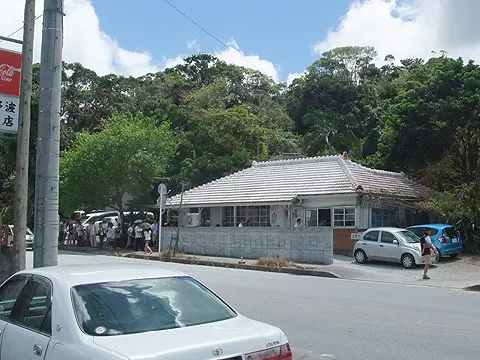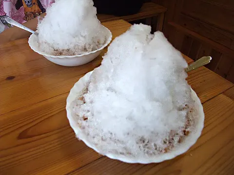 新垣ぜんざいで、氷ぜんざいを食べる。甘いぜんざいにかき氷を盛っただけというシンプルさ。しかし、これが絶妙なバランス。氷をくずしながら、下のぜんざいと一緒にお口へ。うまい。小豆でなく、金時豆なのが特徴。金時豆は普通より二回りほど小ぶりでしたね。20人用まである食券販売機は一見の価値あり(笑)
