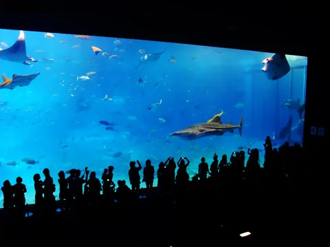 美ら海水族館の大水槽。でっかいし、さかながいっぱい。ジンベイザメが三匹もいる。水槽を見ながら食事もできるので、立ちっぱなしで疲れた足を休めることができます。ゆったりできていいですね。