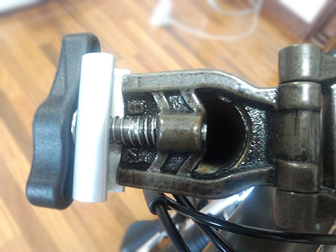 BROMPTONは二つのヒンジで、展開したボディとハンドルを固定します。このヒンジを止める金具がクランプを回すとカラカラ回って閉めにくい。そこで、バネを仕込んで金具が回らないようにしてみました。