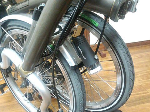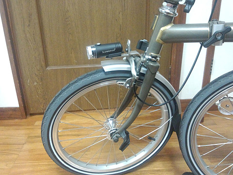 BROMPTONのライトはハンドルにこのような形で取り付けられています。乗車時にはチョイと傾けて使用します。