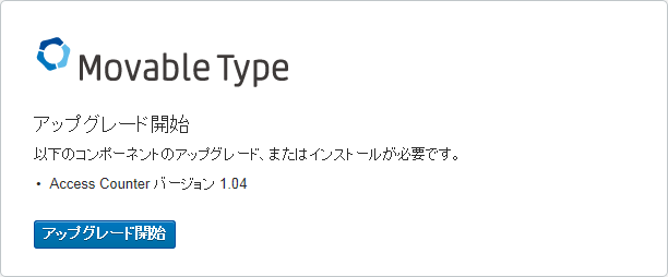MTの管理画面へアクセスすると、下のように表示されるので、「アップグレード開始」を押す。インストールが行われ、アップグレードが完了する。