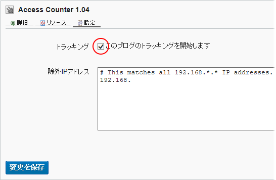 設定 から トラッキング にチェックを入れ、「変更を保存」を押す。除外IPアドレス の項目には、自分自身のアクセスがカウントされないようにIPを入れたりします。