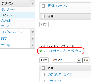 管理画面からデザイン → ウィジェットへと進み、ウィジェットテンプレートの作成 を行います。