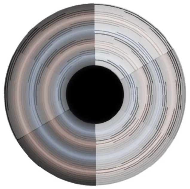 これはベンハムの独楽と呼ばれるもの。錯視の実験として有名な画像で、イギリスの玩具メーカーから発売された独楽が由来となっています。完全に白黒なので他の色は一切ついていません。でも、なぜか人によってさまざまな色が見えてしまう不思議な現象なのです。