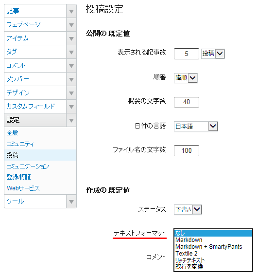 指定したいブログの管理画面から、設定 → 投稿 → 作成の規定値 → テキストフォーマット のプルダウンメニュー で自分に合ったフォーマットを選択。