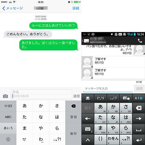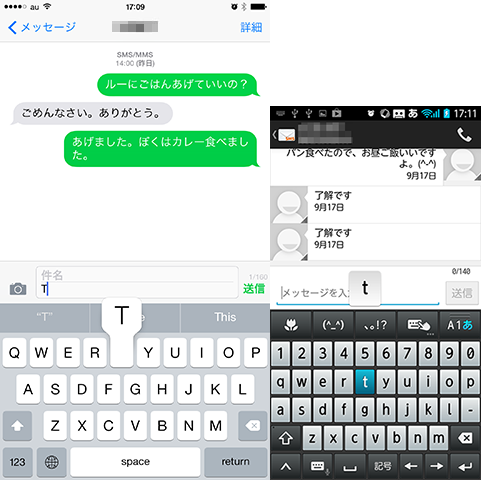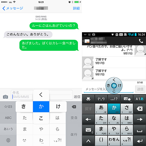 iPhoneでは入力キーの十字配置がそのキーの周りに表示される。これでは自分の指で隠れてしまい、右利きなら「か・け・こ」が見えなくなる。Androidでは、上部に表示され隠れないのが良かった。あと、上部表示にすると実際に押すキーより小さく表示できるので、フリックの移動量も小さくでき、あまり指を大きく動かさなくても入力できるのだ。