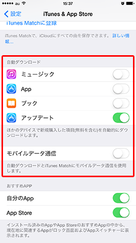 設定 → iTunes & App Store の 自動ダウンロード の各項目と、モバイルデータ通信 のチェックを確認しておこう。モバイルデータ通信 のチェックをはずしておけば、4G回線の接続時にはダウンロードが行われない。