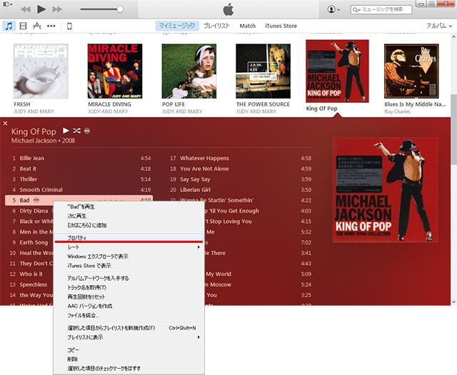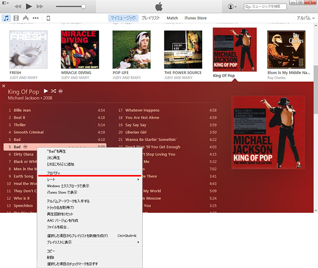 元の曲のすぐ下に、新しく作成された音楽ファイルが表示されるので、選択して「プロパティ」を開く。