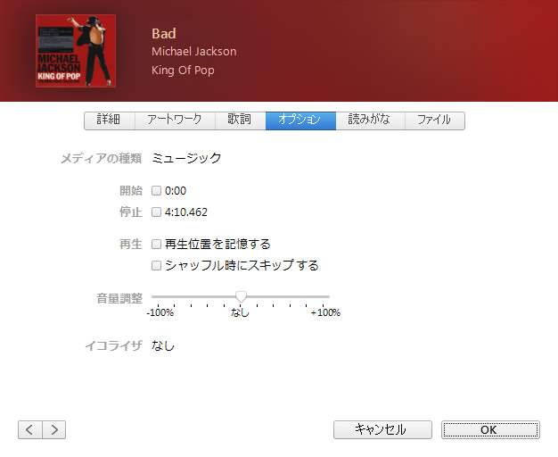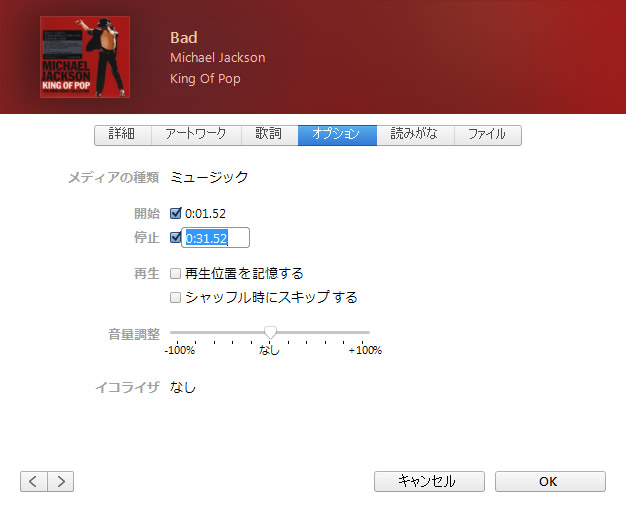 再生時間を調整した元の音楽ファイルを右クリックで「プロパティ」を開き、「オプション」で開始・停止のチェックをはずし、再生時間を元に戻しておく。