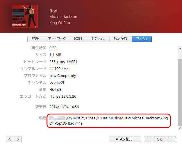 「ファイル」の一番下の「場所」で新しい音楽ファイルの場所を確認する。