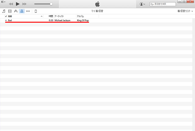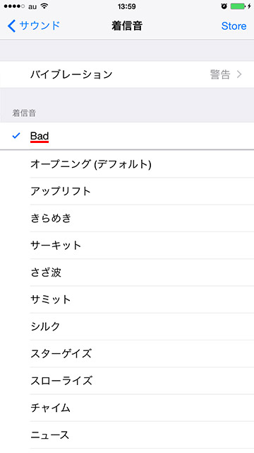 iPhoneの「設定」→「サウンド」→「着信音」の先頭に音楽ファイルが表示されるので、チェックを入れると着信音として指定できる。