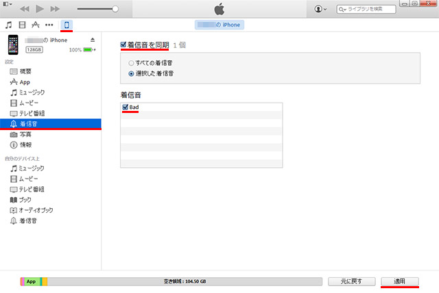 iPhoneをUSBケーブルで接続し、iTunesの左上の「iPhone」を選択。設定の「着信音」で、「着信音を同期」にチェック、着信音に表示されている音楽ファイルにチェックし、「適用」ボタンを押す。