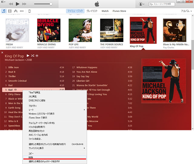 iTunesのアルバムに不要になった音楽がリストに表示されたままになっているので、右クリックで「削除」を選択し削除する。※間違って元の音楽ファイルを削除しないように!