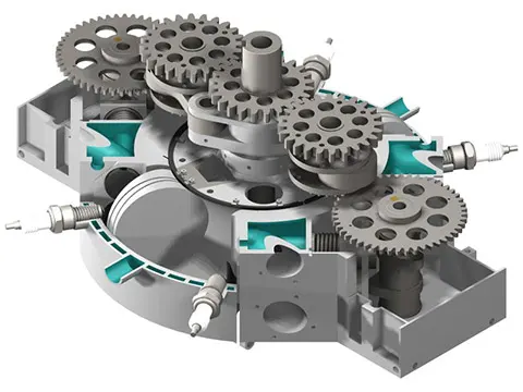13.9kgって軽いな。自転車1台くらいじゃないか。煽ぐようにピストンが動き、4つの燃焼室で次々と爆発してる。1ユニットで4サイクルエンジンを4発積んでいるようなものか。円弧状に動作するため、直線的に動作する通常のピストンよりロスが少ないようです。