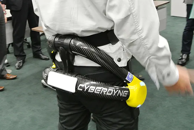 以前にも紹介したサイバーダイン社が、腰部をサポートするパワーアシスト装置を披露。2本の湾曲したメインフレームがコンパクトにまとまっていてカッコイイ。衣服の上に装着なのに筋電を感知できるのか。