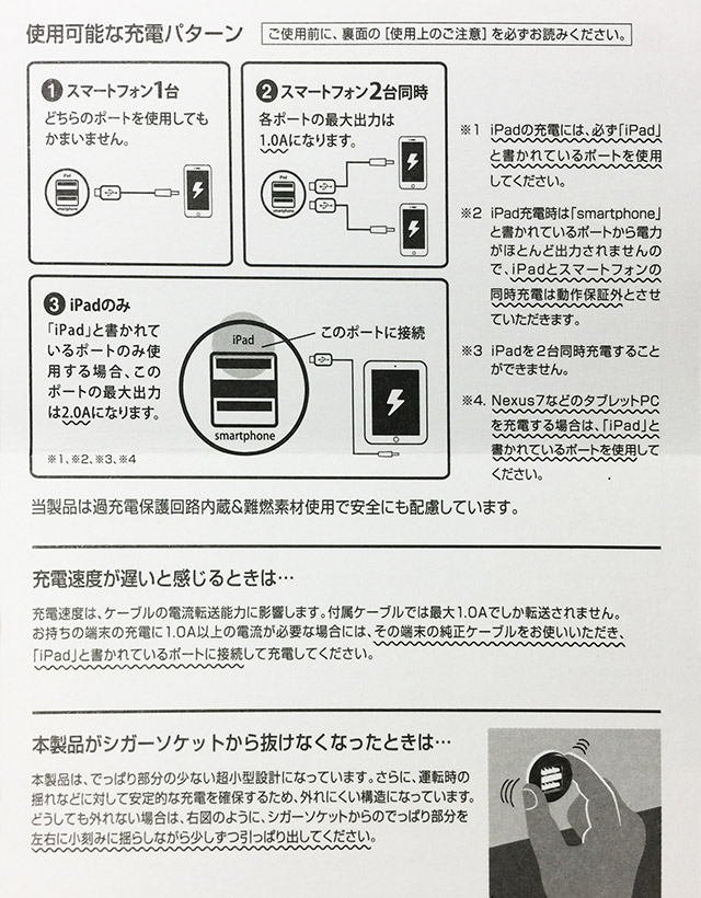 保証書兼取扱い説明書が入ってます。文字が読めるよう大写しにしましたので、情報をご確認ください。ふむ、スマホはどちらのポートに挿してもよいのか。iPadとの同時充電は動作保証外と。保証は購入から6ヶ月間です。