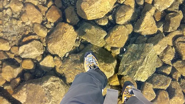 スロバキアのタトラ山脈を行く登山者二人。凍った湖の氷が透明度高い!普通は氷中に気泡があったり、表面に霜が降りたりして透けて見えないもんだけど、うまく気象条件が揃ったんでしょうね。ここまで見えると割れて落ちそうで怖い。