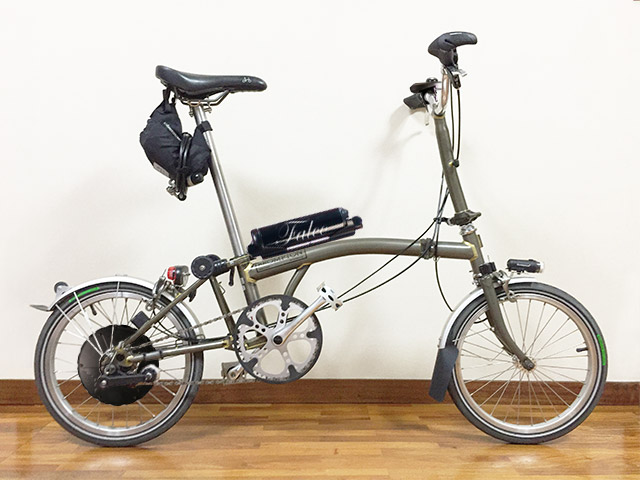 試しにPhotoshop上でBromptonに装着してみた。見た目は意外といけてるw 後輪のモーターに無理があるな。折り畳みの小径車には厳しいか。