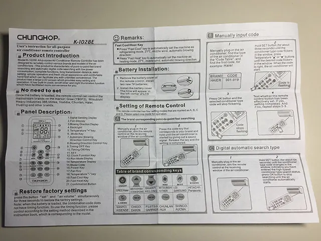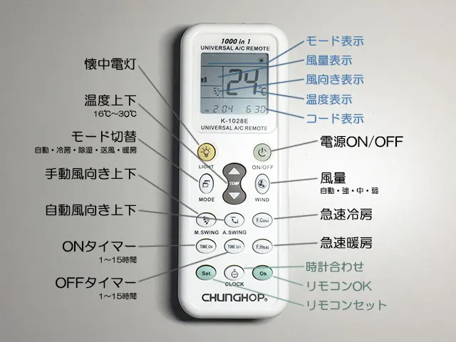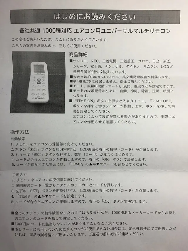 けど、主な使い方と、リモコンをエアコンに合わせるコードのセット方法が書かれた日本語の操作説明書も入ってるので大丈夫。