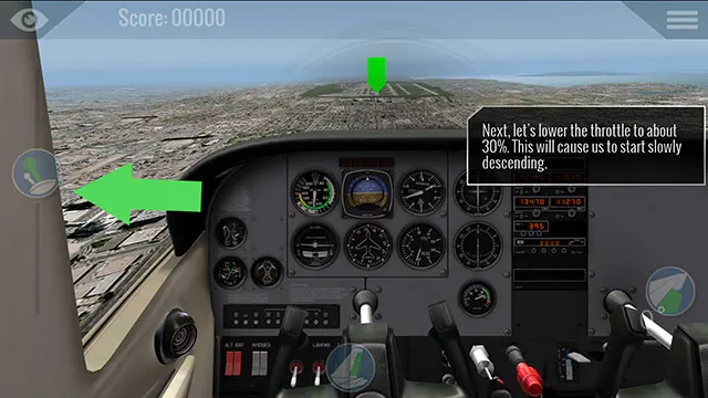 場所はシアトル・タコマ国際空港。こんな感じで降りて行きます。スロットルを30%に絞れと指示が出てるので、左のスロットルアイコンを下へドラッグ。